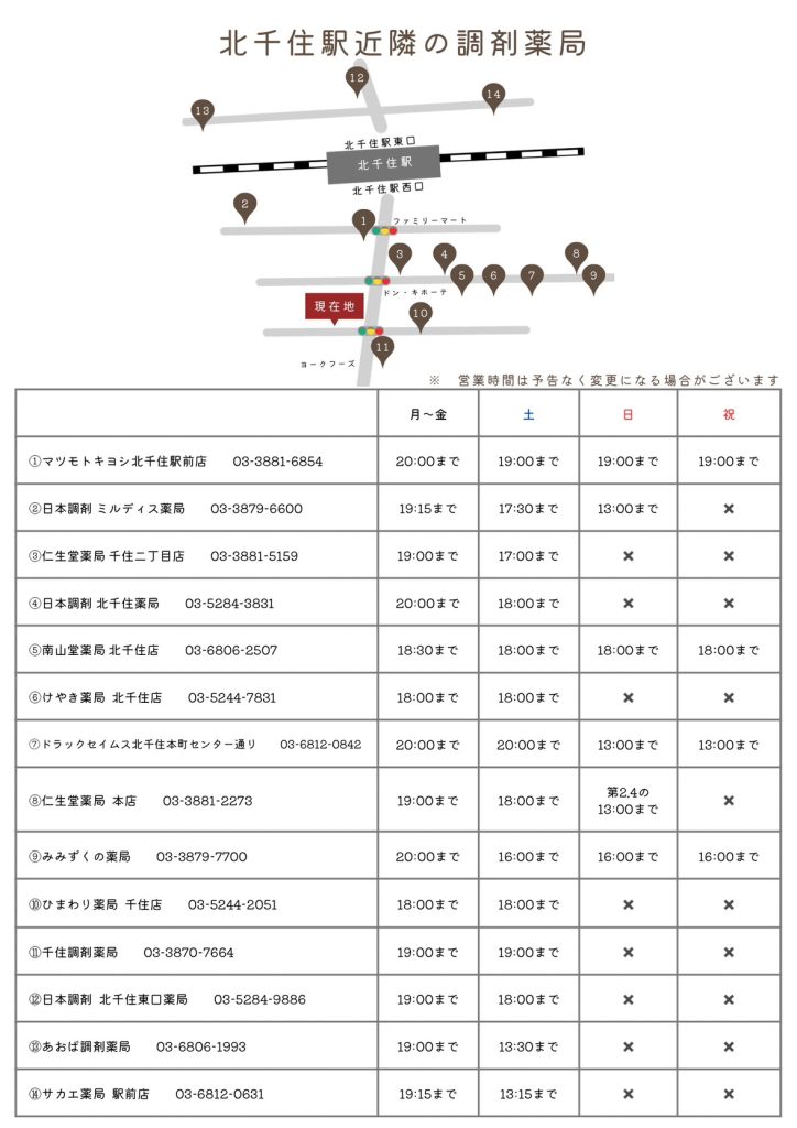 当院の周辺には、「マツモトキヨシ北千住駅前店」「千住調剤薬局」「日本調剤北千住薬局」など多くの調剤薬局があり、平日夜間や土日祝日もお薬の受け取りが可能です。近隣薬局については自動精算機横に掲示物がございます。